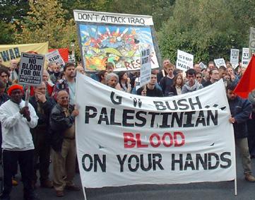Most of the participants were young with the older ones coming from a variety of organised groups, the parties of the far left, anarchists of the WSM, Palestine solidarity groups, the Green Party and various religious groups both Islamic and Christian. There was also a small group of 'US Citizens against the war'. Unlike the earlier anti-war and freedom for Palestine marches of this year there was no visible Islamic fundamentalist presence, no 'God is great' chants and only one obviously anti-Semitic placard.