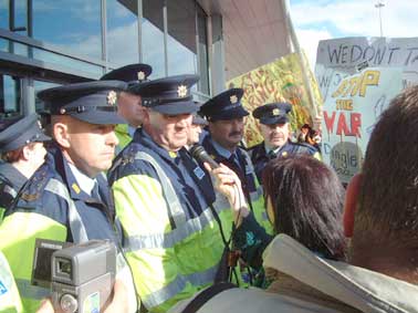 As we marched up the approach road a Gardai van with a video camera on its roof was observed filming the demonstration from a roadside car park. So some of the demonstrators stood in front of it and raised their placards in front of the camera to make sure the anti war message of the demonstration was recorded rather than the identities of those taking part. Outside the terminal a second Gardai with a hand held digital camera was also taking photos of the protesters.