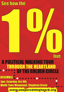 On Saturday October 9th a political walking tour through Dublin 2 and Dublin 4 will take place. In this area Banks, private mansions and corporate headquarters sit side by side in the heartland of the ‘golden circle’. The tour aims to highlight the deep injustice at the heart of Irish society