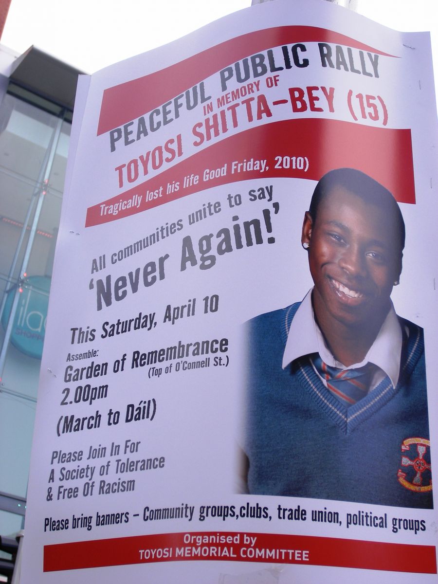 People gathered at the Garden of Remberance on the 10th of April - to support the family of Toyosi Shitta-bey, a 15 year old boy who died after being attacked on Good Friday. People were there to send out a message that racist attacks have no place in the Irish society that we want, and that this should never happen again.