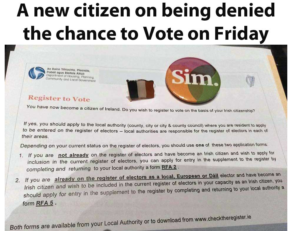 While there is a lot of focus on Irish citizens returning home to vote Yes in the Repeal referendum what has received less attention are the huge numbers of non-citizens resident in Ireland who have no vote. They are also trapped under the 8th amendment. Some 3,000 have recently received Irish Citizenship but shockingly it turns out they have not been added to the electoral register even though arrangements are made for young people turning 18 just before May 25th.