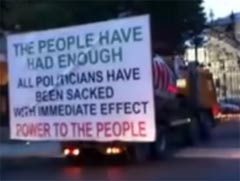 Yesterday morning when news of the cement truck blocking the Dail gates broke politicians and possibly Gardai spun the story to make it sound as if this one man protest was a lot more dangerous then the reality. We were told Gardai had to jump out of the way of the truck and that it crashed into the gates. Now mobile phone footage showing the entire incident reveals that the truth was not being told about this one man protest by a minor developer.