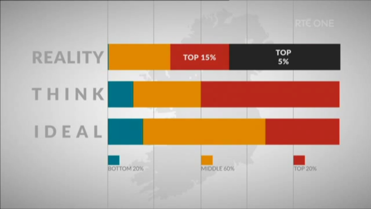 Monday night (22/09/2015) RTE aired the misguided David McWilliams documentary "Ireland's Great Wealth Divide". It points out that the richest of the rich have far, far more than their fair share and that it's considerably worse than "we" think it is - this is demonstrated with opinion poll data (see image below) showing how Irish people would like wealth to be divided, contrasted against how "we" think it's divided and how it's actually divided. It also argues against the notion of trickle down economics, pointing out that the wealthy don't let their money trickle down and do not create jobs.