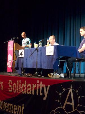 Mark Hoskins of the WSM debates MEP Paul Murphy on what positions the left should take on the Fiscal Compact to be voted on in Ireland May 31st. The SP is arguing for a No vote, the WSM argues that the vote doesn't matter, what matters is resistance to austerity. This debate took place at the 2012 Dublin Anarchist Bookfair in Liberty Hall.