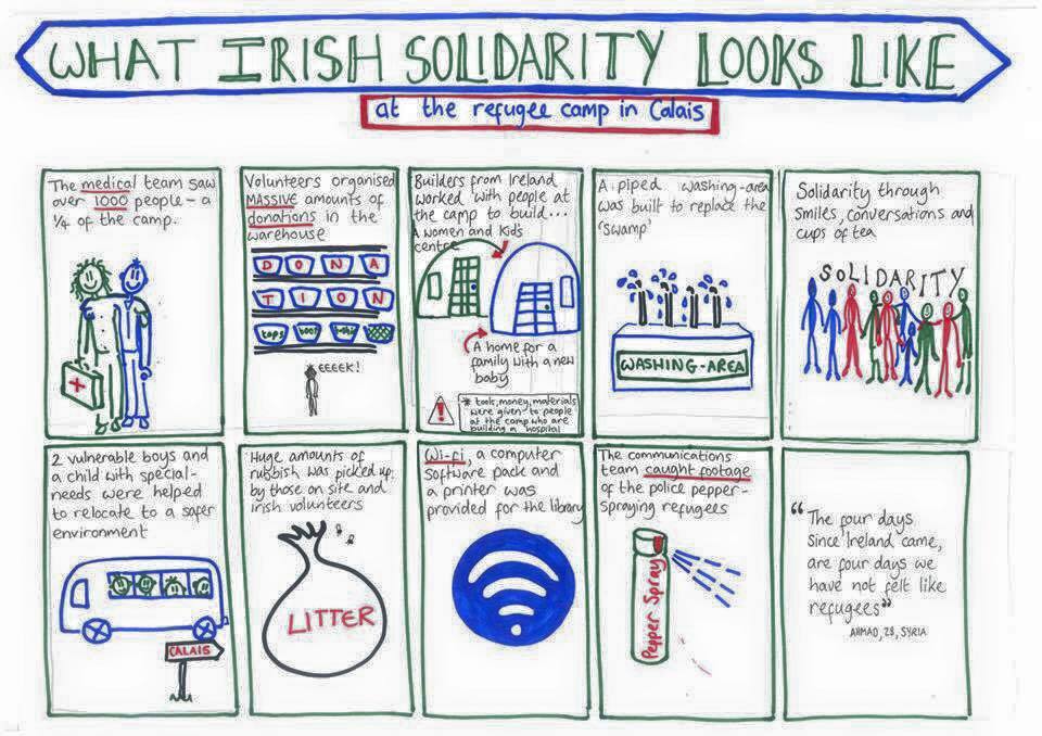 The first solidarity convoy from Ireland to Calais returned a few days ago and Mairead Mary Frances Healy posted a great report on what was done (below) that has now been turned into this graphic. We applaud this solidarity with those who have spent the summer fighting the racist border policy of Fortress Europe through the direct action of breaking down the fences.
