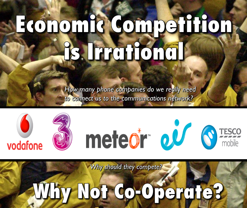 How many of these companies does a rational society really need? Their job is to connect our mobile phones to communications networks (GSM, 3G, 4G, Wi-Fi). Do we really need five such organisations in the 26 counties to attempt that same task? And who does it benefit that these five organisations compete with one another for profit? After all, they are all using the same infrastructure! Surely five organisations co-operating will be more effective than five walled-off organisations each attempting the same task individually.