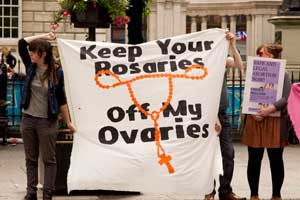 After spending tens of thousands of euro in promotion, Youth Defence’s anti-choice march finally took place in Dublin on July 2nd last. Despite the free coaches and months of preparation only about 3000 took part, making it a tiny fraction of the Pride Parade of the previous Saturday. In the week before the anti-choice march, three or four people met to initiate a pro-choice counter demonstration. This proved somewhat controversial as many pro-choice activists feel that it is better to simply ignore those who would seek to jail women to prevent them controlling their own bodes. But despite having no resources, and advertising only though a Facebook event, somewhere over 300 people turned up on Saturday to provide a counter point to the bigots parade.