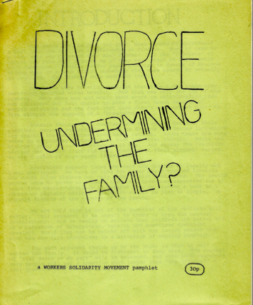 This pamphlet was produced by the Workers Solidarity Movement in the weeks before the 1986 referendum on whether or not to remove the constitutional ban on divorce. The vote was lost by a margin of almost 2:1, with 935,843 (63.48%) voting to keep the ban and 538,279 (36.52%) to remove it. A second referendum in 1995 saw the ban finally scrapped, with a result of 818,842 (50.28%) to 809,728 (49.72%).