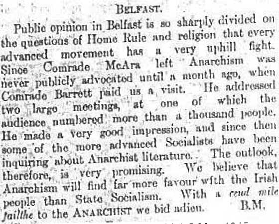 Although Kavanagh fails to mention it, McAra’s activity in Belfast did, in fact, leave a group in its wake, though this may have had its origins out of those who supported him while a prisoner in Crumlin Road gaol.(3) As with many other areas discussed in this work, much more research needs to be done before we know exactly when the first Belfast anarchist group was launched and who was involved with it, as well as the wider question of its efforts and impact.