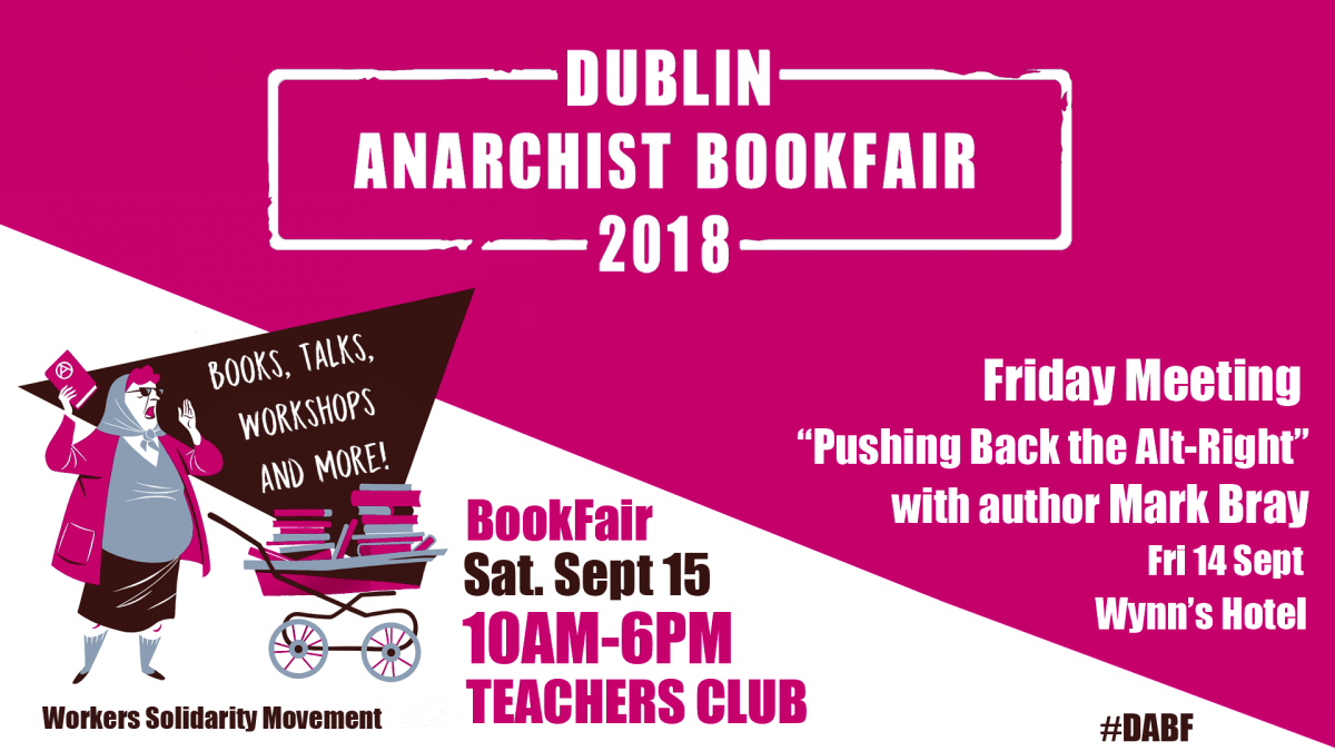 The provisional timetable for the 2018 Bookfair is below but we are also having a Friday night meeting 'Pushing back the alt-right in the US' with Mark Bray author of the Anti-fascist handbook in Wynns Hotel at 20.00.  More details at the Friday Facebook event