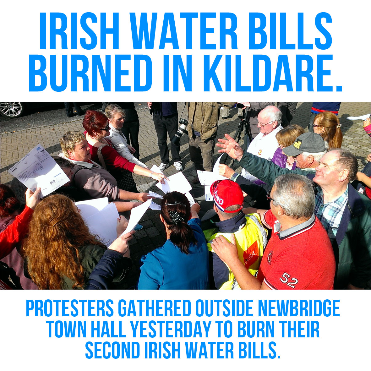 Yesterday afternoon in Newbridge, Co. Kildare, a crowd assembled at 2pm outside the town hall in order to collectively burn their bills in a symbolic act of defiance of Irish Water and the government's plans to introduce a double charge for water provision. The assembled protesters understand that if everyone paid up and Irish Water managed to establish these charges, they would rapidly increase to the point where water charges were a lucrative revenue stream for the company and a significant drain on our limited incomes.