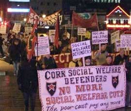 At just after 5 p.m. Wednesday evening, 600 angry marchers took to the streets of Cork city to demonstrate their opposition to the 2011 budget and the state's IMF- and EU-designed four-year plan. Marchers assembled on Patrick's Bridge for some time before 5, and when sufficient numbers had arrived, the crowd moved up-river to the nearby Emmet Place in front of the Opera House, from where the march departed, led by the banner of the Cork Social Welfare Defenders campaign.