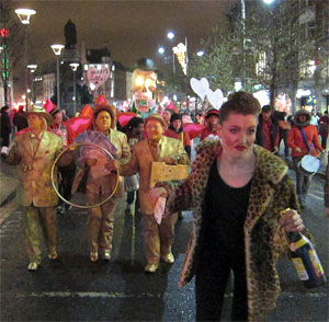 Several hundred people took part in "A Spectacle Of Defiance And Hope" in Dublin Friday night to protest the way the government have cut funding to vital community services. Janice Feighery a co-ordinator at an after school computer program for young people said “Community programmes are being devastated by the cuts. Our work with young people is strangled by lack of funds." The spectacle draws to a close the week of protests against the austerity budget.