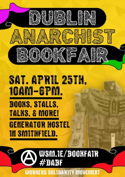 Stalls at this years bookfair will include AK press, Irish Labour History Society, Atheist Ireland, Seomra Spraoi, Rebel County Books, Anti Fascist Action, Ireland Palestine Solidarity Campaign, PM Press, Abortion Rights Campaign, Stoneybatter & Smithfield peoples history project, Rabble, Alliance for Animal Rights, Look Left magazine, National Animal Rights Association, Basic Income Ireland, International Bolshevik Tendency, Sex Workers Alliance Ireland, Anti-Internment Ireland, An Spreach, Glasgow Anarchist Collective, Workers Solidarity Movement