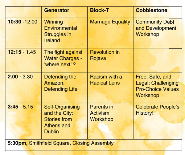 This panel will look at the challenges and possibilities of popular self-organisation to reclaim our lives, our homes and our cities. Katerina Nasioka will discuss the social consequences of the crisis in Greece, critique the hope promised by SYRIZA and, finally, look at the contradictions that social movements and self-organized experiments face in the present moment. Jenny and Zoe will look at recent occupations in Dublin, including the Grangegorman Squat in Smithfield where resistance to eviction is ongoing