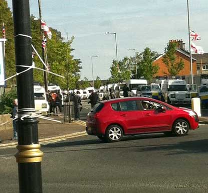 As many choose not to disperse it was clearly a wait and see approach before it kicked off as such. As usual, it only took a few stones and water cannon to be used before several hours of sustained rioting erupted. Police lines came under attack at two entries into Ardoyne and soon the police who took up position on the rooftops of Ardoyne shops had to withdraw under a barrage of missiles. It did not take long until the first petrol bombs were thrown and hijacked car to be burned close to police lines. The crowd bust into applaud and chants of "SS-RUC" erupted.