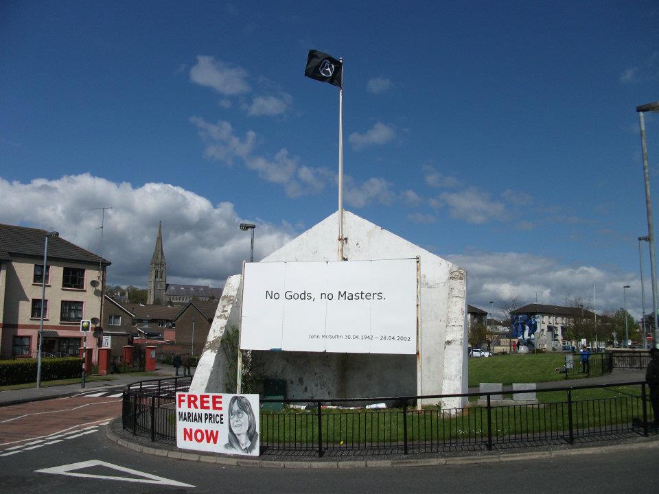 On the 10th anniversary of the death of former Civil Rights activist and Anarchist John McGuffin, local activists including former friends and comrades gathered in Derry’s Bogside and gave the iconic monument a fitting rebellious make-over with the red and black colours of anarchism. Over the next fortnight the black flag of anarchy will fly over Free Derry corner in a fine tribute. No Gods No Masters!