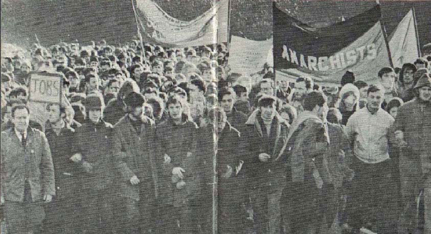 By March 1969, McGuffin was in Manchester as a speaker to the Revolutionary Socialist Students Federation (RSSF), fresh from the Burntollet march and seems also to have appraised anarchists in England of circumstances in the north and events to come. He was a principal organiser for the next major PD march from Belfast to Dublin in April 1969, which was attended by many English socialists and some 40 anarchists. Numerous anarchist flags were carried on the march and some women members of the BAG made a number of anarchist neck-scarves, ‘a typically sexist job allocation’, as one BAG member recalled. This splash of anarchist colour, however, even led some journalists to label it an anarchist march. The march was plagued by difficulties from the start, beginning with a violent confrontation in Lurgan (where it actually set off from after problems in Belfast), and ending with divisions between PD and some of the southern left- wingers.