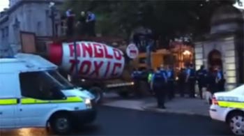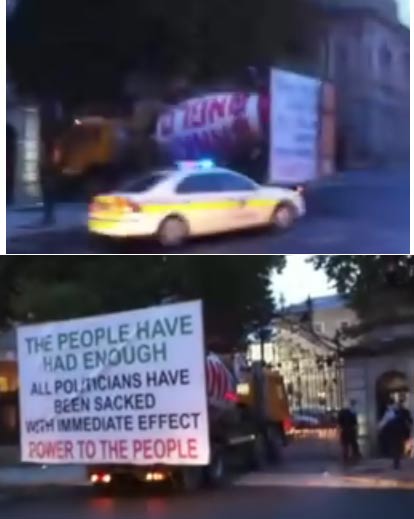 Yesterday morning when news of the cement truck blocking the Dail gates broke politicians and possibly Gardai spun the story to make it sound as if this one man protest was a lot more dangerous then the reality. We were told Gardai had to jump out of the way of the truck and that it crashed into the gates. Now mobile phone footage showing the entire incident reveals that the truth was not being told about this one man protest by a minor developer.