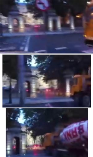 The first three stills show then truck arriving at Kildare street and driving across to the gates of the Dail where it stops. There is no one in front of the gates at the time, no one to jump out of the way. The truck stops and within seconds a loud hissing can be heard, presumably the brake lines being cut so that they brakes lock on and immobilize the truck.