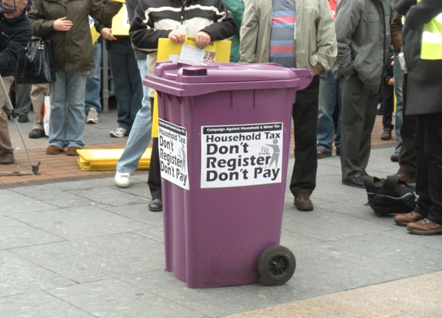 In Cork the mobilisation for the National Day of Action against the Household and Water Tax saw a lively and noisy crowd of over 500 hundred march through the centre of Cork City. At the rally beforehand members from some of the local areas involved in the Campaign in Cork took advantage of the open mic forum to explain why they opposed the tax. Speakers from Farranree, Bishopstown and Cobh declared their intention not to register or pay the tax. The fact that the tax is unjust and will rise sharply in a short period of time was highlighted. It was also pointed out that the proposed Water Tax which will follow shortly on the heels of the Household Tax is also a major threat. The proposed Water Tax in itself will be a major burden and one that will hit the majority households harshly.