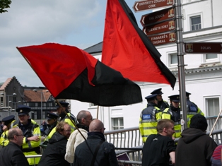 The main protest was called by Cork’s Sinn Fein. Beginning at 12.30 pm the crowd was entertained with republican ballads. This protest was later joined by anarchists, some from the Workers Solidarity Movement, and by a range of socialists and members of the IRSP. The Cork 32 County Sovereignty Movement also appeared along with other independent socialists and republicans. In all about five three hundred took part. There were a series of confrontations and at one on Washington Street, police drew batons and struck protestors.