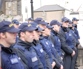 The heavy Garda presence included riot cops, dog handlers, the Garda helicopter and several other small aircraft, the Garda mounted unit and any number of uniformed and plainclothes officers. Public order units were seen on South Gate Bridge, Clarke's Bridge and St. Finbarre's Bridge. As protestors moved along the southside quays, Gardaí responded to block access off to the centre. In spite of this, a handful of protesting citizens made it as far as Washington Street, but were then confronted by numerous police.