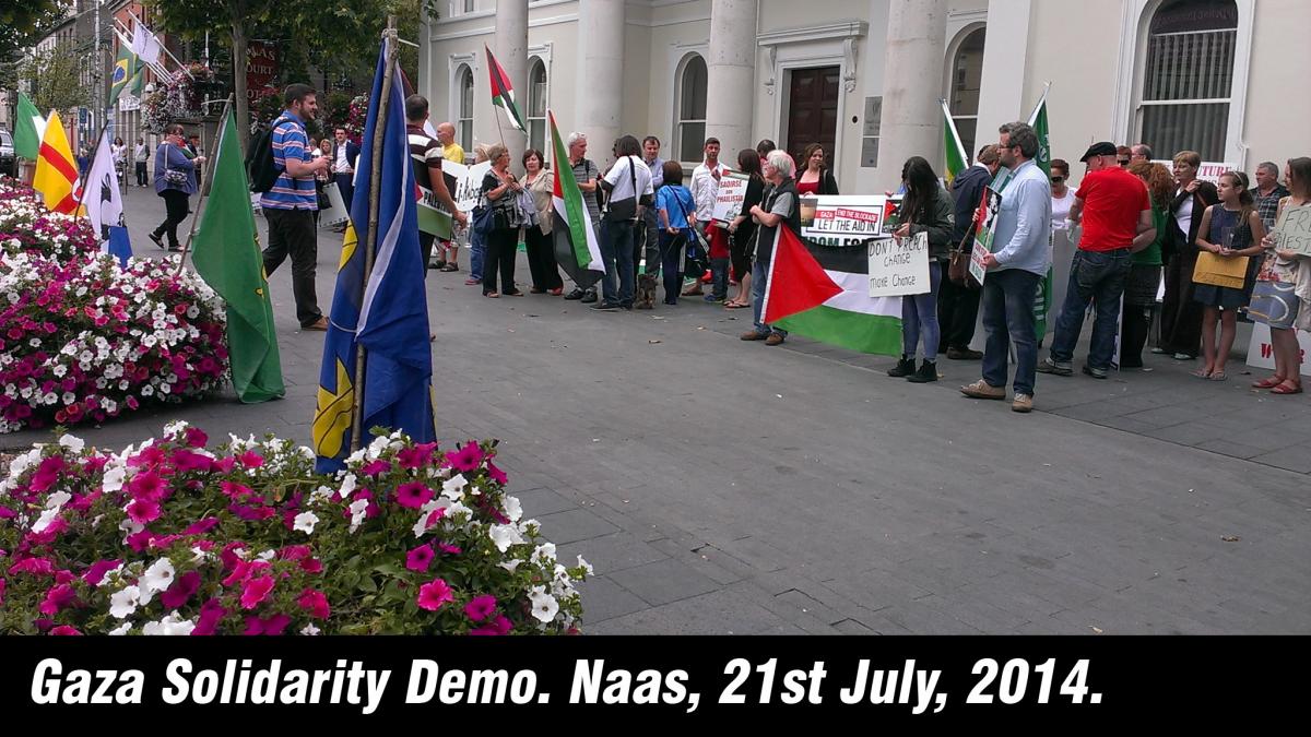 In response to the Israeli Defense Force’s (IDF) latest assault on the people of Gaza, well over 150 people came out for a Gaza solidarity demo in Newbridge on Monday evening. This follows on from a previous well attended demo that took place in Naas on July 21st. Supporters and friends of Palestine rallied in front of Newbridge town hall and many Palestinian flags and banners expressing solidarity with Gaza were on display. The demo was well attended by political activists including members of Sinn Fein, Community Solidarity, Workers Solidarity Movement and many more campaigners and councillors.