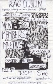 RAG, Revolutionary Anarcha-feminist Group, are currently working on The Rag no.6 which will be out in March 2012. If you'd like to learn more about RAG, find out who we are and what we do come along. We are also looking for new members (women and women-identified). If you have any questions or comments you can get in touch ragdublin at gmail dot com. The discussion on Monday will be open to everyone - all genders!
