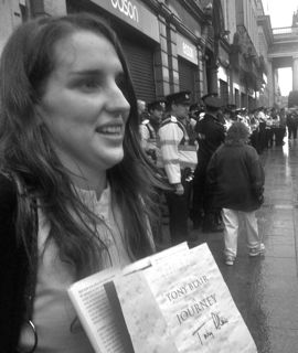 Photo journalists outside of Eason's reported that only one photographer was allowed into Eason's and they were told they were only allowed to photograph Blair and the book and no one else. Conditions for those wanting to get a book signed included that they were not allowed to be carrying cameras or mobile phones. Clearly Blair is terrified of his publicity tour for the book backfiring but despite his precautions and the dozens of police protecting him even the mainstream news coverage concentrated on the unexpected size of the protests.