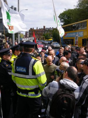 About 100 people were gathered outside this infamous bank, Anglo Irish Bank, on St. Stephens green by the time I'd arrived. I had already been informed of the fact that 7 members of Eirigi had been arrested after occupying the building from early morning. The Gardai had sprung into action and decided to clear out the occupation and they'd done that with the brute force that's become a bit of a speciality over the last few years.