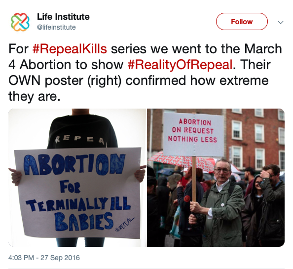 This is more than a little odd. It appears that someone prominently associated with Youth Defence was on the March for Choice in September complete with a (fake) Repeal jumper and an obnoxiously phrased placard. Another activist on the way to the march saw the same women with one of the Youth Defence leaders.