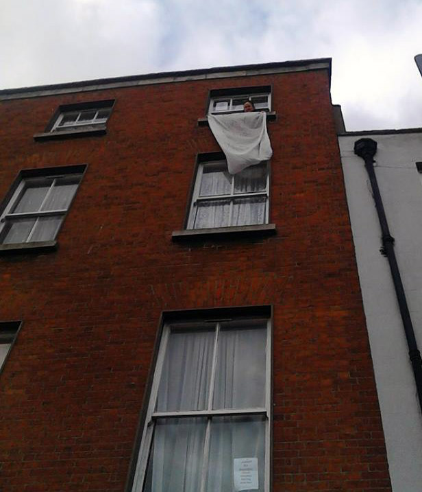 The families who were being housed in an emergency accommodation facility on 54-55 Mountjoy street and were to be evicted today have been fighting back. Yesterday afternoon they occupied the DCC offices, demanding that officals talk to them collectively. And this morning they occupied the buidling they are being evicted from, hanging banners from the upper floor as a solidarity protest took place below.