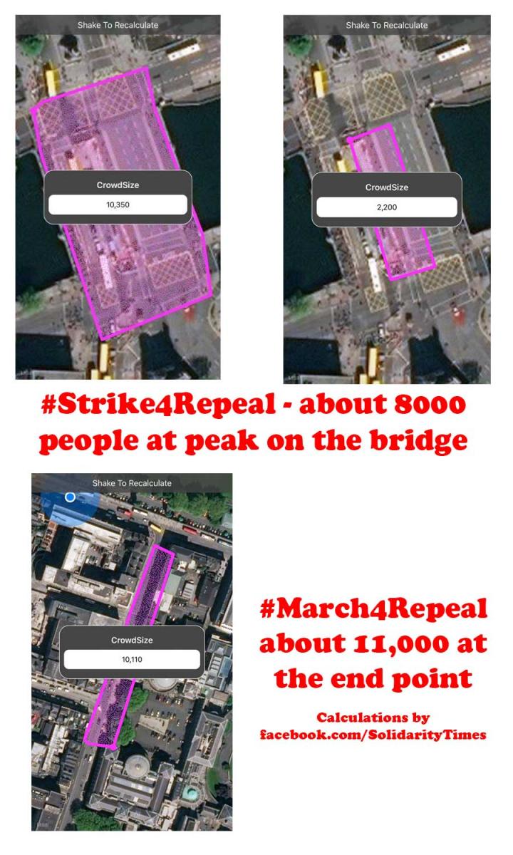 The packed in nature of the #Strike4Repeal on O'Connell bridge made it impossible to do an actual count. So we've done the next best thing, used the area occupied to calculate how many people could have fitted into the space photos show was occupied. We also did the same thing for the later #March4Repeal