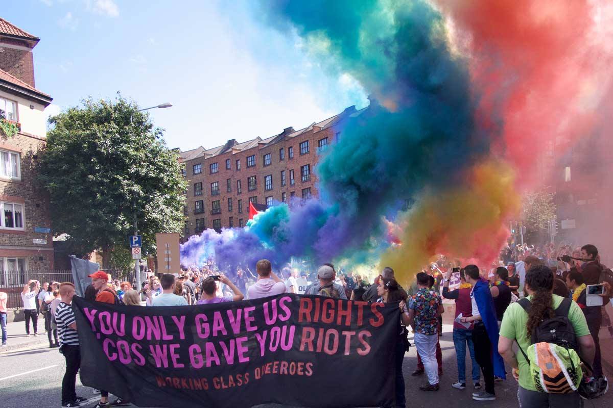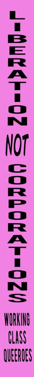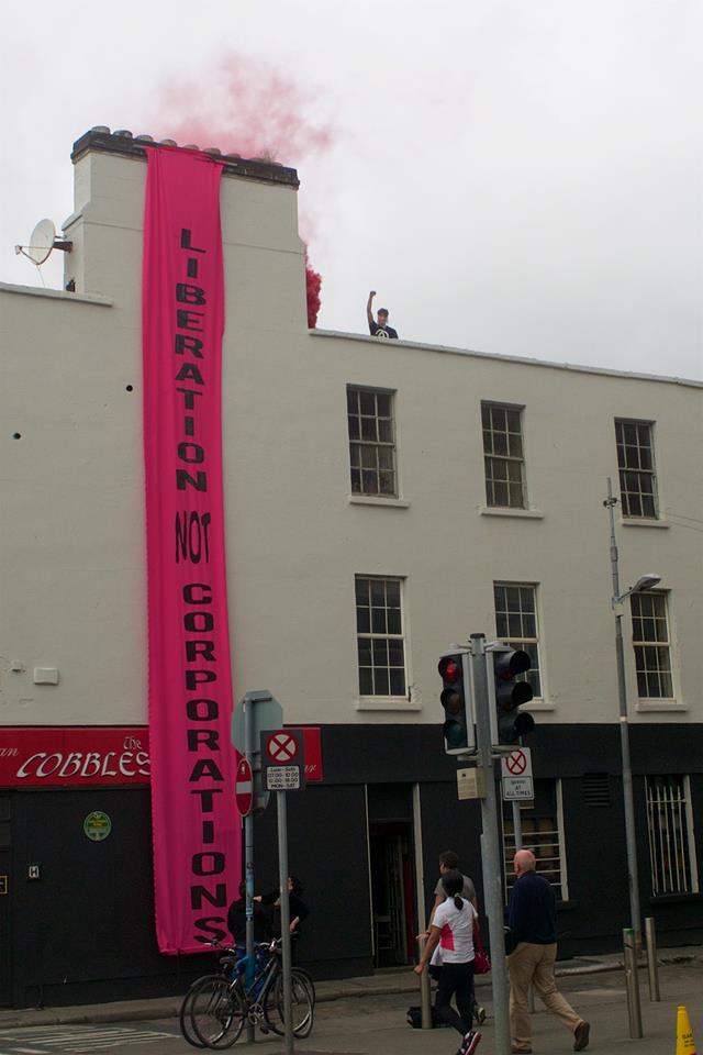 Here's the final Drop banner. The same comments above apply. Although, it wasn't well received by some as we positioned it so that our 'Liberation Not Corporations' banner was the first thing people saw when the Pride parade arrived at the finishing point at Smithfield Square! We can only speculate as to whether it was Facebook, Bank of Ireland, Amazon, Deloitte, Paypal, or Tesco (or the other 62 corporations present) who were the most annoyed.