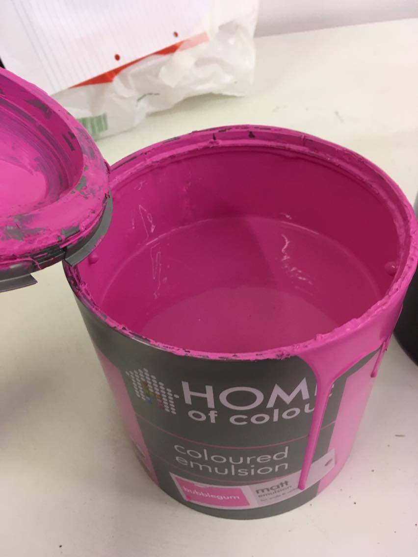 The pink paint inadvertently came in handy as a kind of pink Tippex for the mistakes/spills on Drop banner, since it had a pink background. Look how much pink we used, not even a litre.