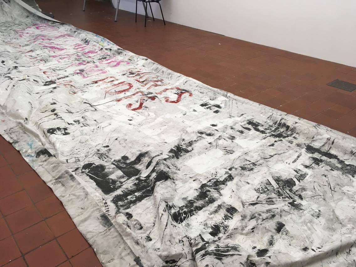 We bought 6 metres of fabric because I thought it would have to be 1.5 times wider than the May Day banner. This was because there are more words per line in the Pride banner. However, I was mistaken and we only used 5 metres, cutting off the extra meter at the very end using a Stanley blade.