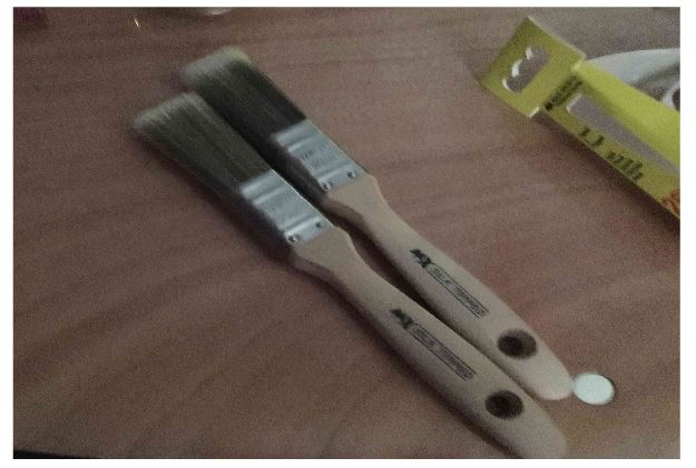 You need brushes to paint with. We started with 2 brushes (for two of us, shown below). Soon we realised that these brushes were bad for achieving neat lines at the edges of the letters, and went to a nearby hardware shop to get better ones. I forgot to photo these, but they weren't a million miles off the ones shown below, just with a slightly narrower tip. They were better, but it was still quite an effort to get clean lines. Really you want brushes with a very fine tip, this will make you curse less.