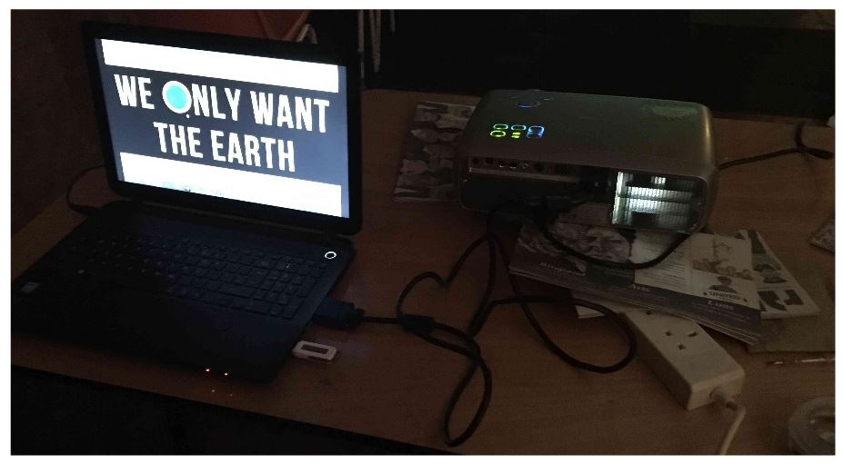 We put the projector on a table with the laptop and connected them. Originally this was 3-4 metres from the wall, but when we projected onto the banner the image was too small. We realised we had to move backwards a good bit so that the image would spread out onto the banner. The banner is quite tall so we wanted to put the text a bit lower down so that people could bunch it up at the top while carrying, without distorting the slogan. We had to prop up the projector with some stuff to point it a bit downwards, and also to correct for a slight slant so that the letters were perfectly flat across.