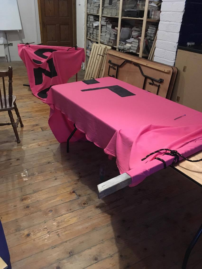 Secondly, a place to make it. You need plenty of room, a large enough wall to hang your banner, and need to know that the banner can stay put while it dries without someone moving it or walking on it. We made our May Day banner in Jigsaw, which is a fantastic anarchist social centre in north Dublin city, in which the WSM Dublin branch has our office. We made the Pride / Drop banners in A4 Sounds, an artists' studio which sometimes rents out a big room to others for events.