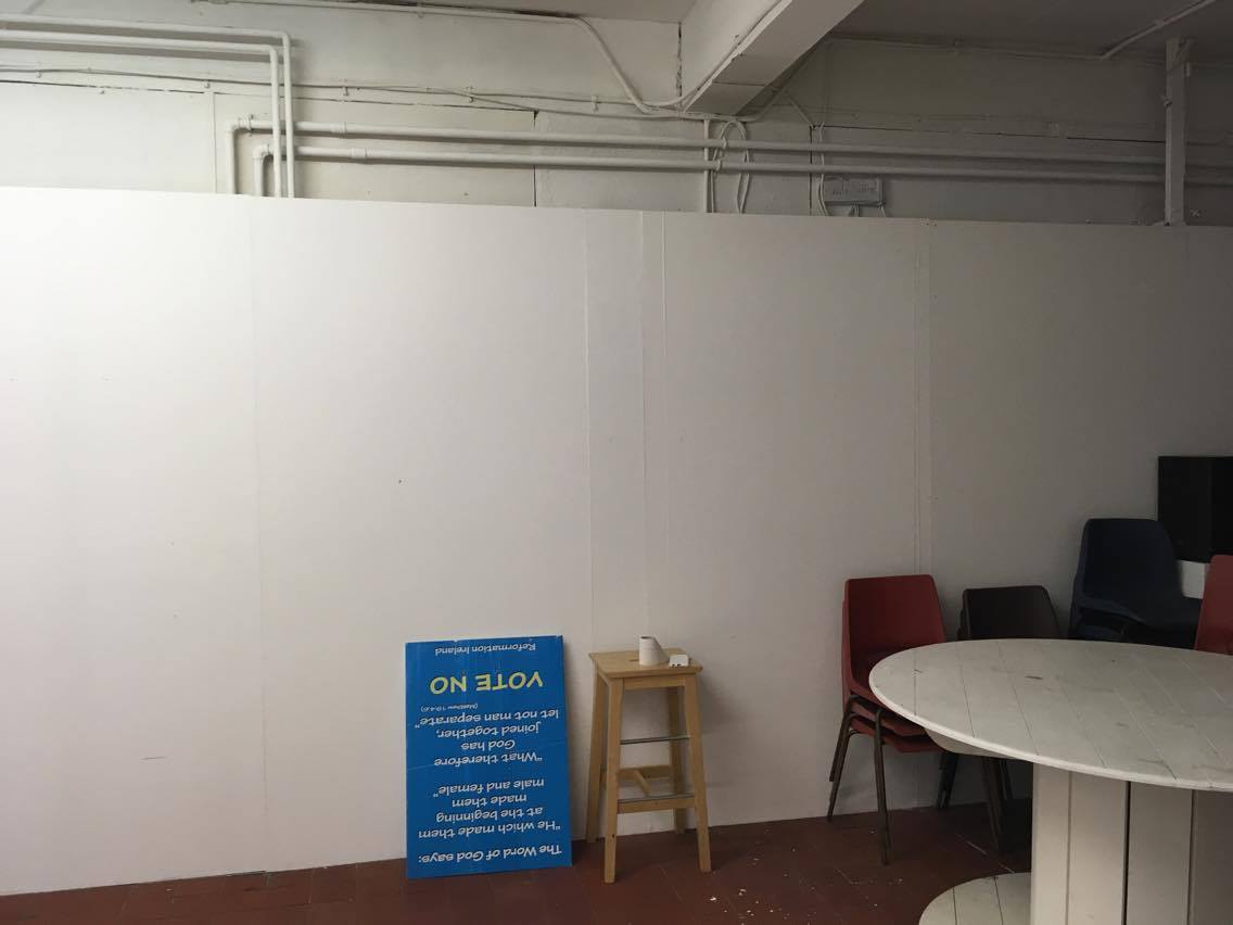 However, for the Pride/Drop banners we used A4 Sounds because Jigsaw was busy that day. It cost us money, but it turned out to be much better for us as A4 Sounds has a significantly longer wall which was needed for the very, very, long Drop banner, and indeed for the Pride banner which would have been a bit too big at 5 metres. In the pictures below you can see how long the wall is (you can also see an upside down Bible-quoting 'No' campaign poster from the Equal Marriage Referendum which we brought).