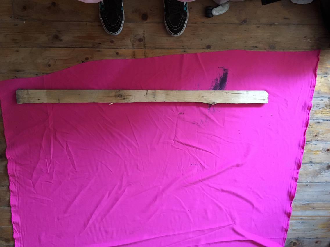 To do this we made the fabric into a loop at the bottom and the top of banner by folding it back on itself and stitching it. The photo below shows the wood at the bottom of the banner.