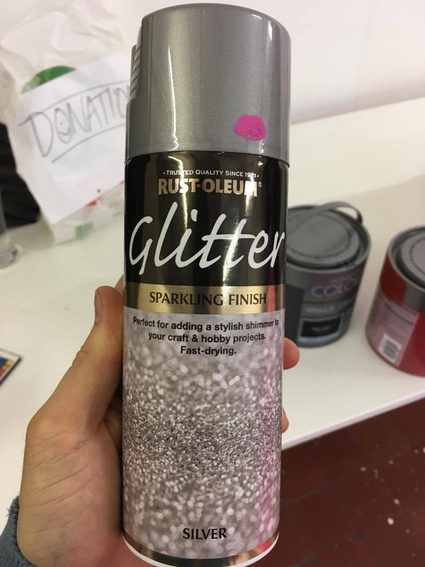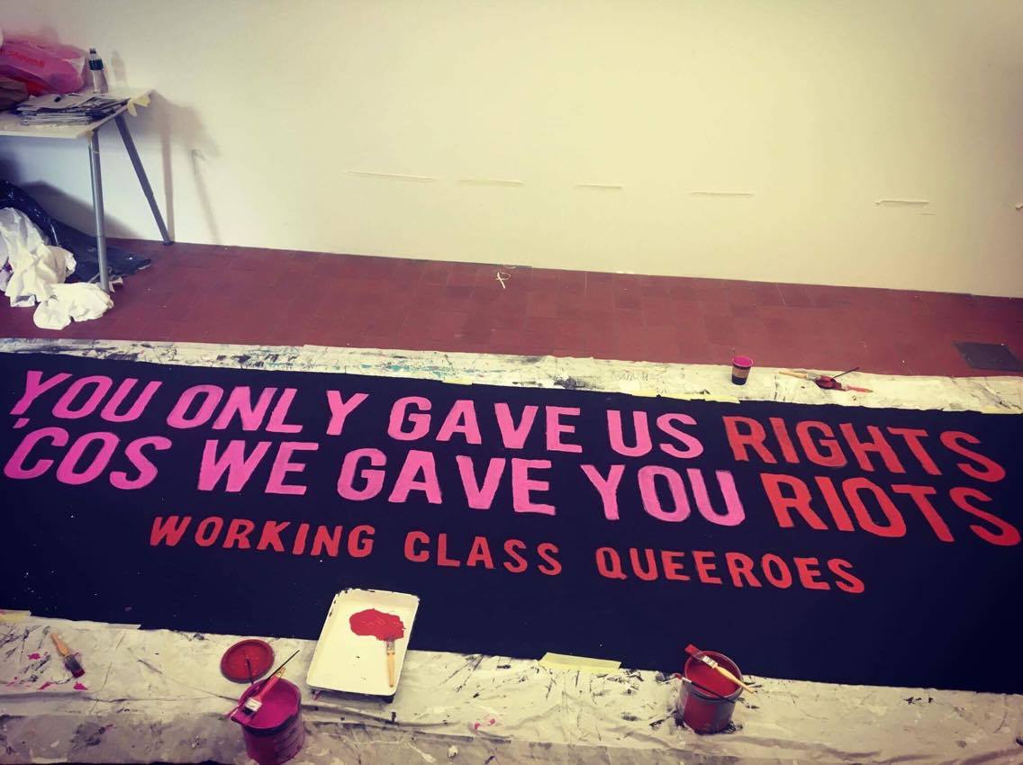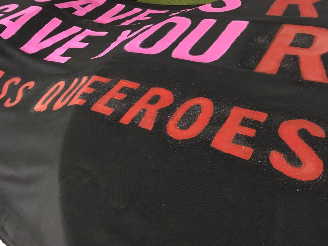 For the Pride / Drop banners we bought a can of silver glitter paint. It's quite expensive at €13 and it only covered the word 'Liberation' on the Drop banner, and 'Working Class Queeroes' and 'Riots' on the Pride banner. But it really does work.