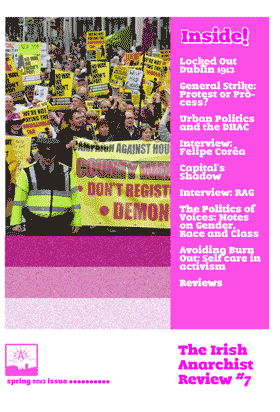 Welcome to issue seven of the Irish Anarchist Review, published by the Workers Solidarity Movement. One hundred years on from the great Dublin lockout, the labour movement in Ireland stands at a crossroads. In this issue, we look at some of the struggles of the past that lead us to this moment in history and consider ways that we can progress the reconstruction of working class organisation. We don’t think there is a magic formula for success; rather we hope this magazine can be a forum for debate for activists who are involved in the struggles that are going on in 2013.