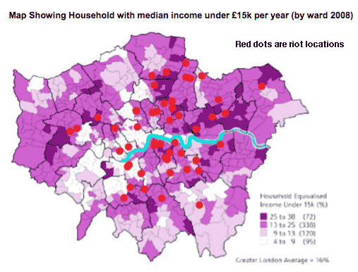 The right and the bulk of the media want to deny any connection between poverty and the rioting but as the map makes clear the reality is that the riots almost all occurred in and around the districts where the poorest sections of the working class live.