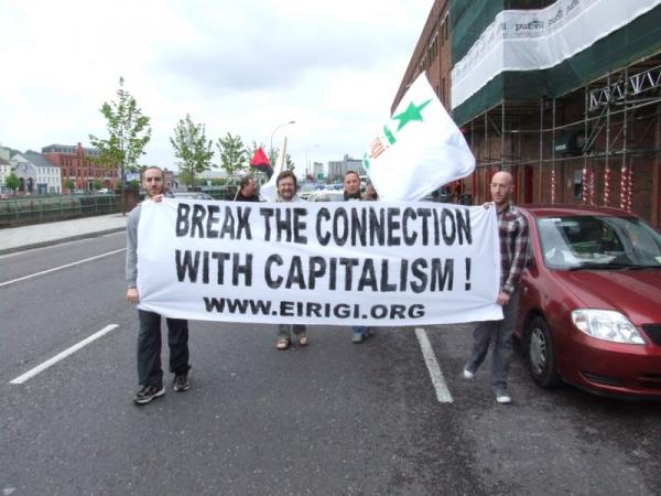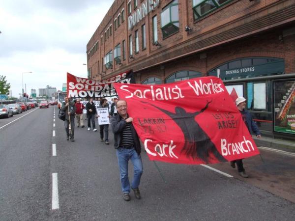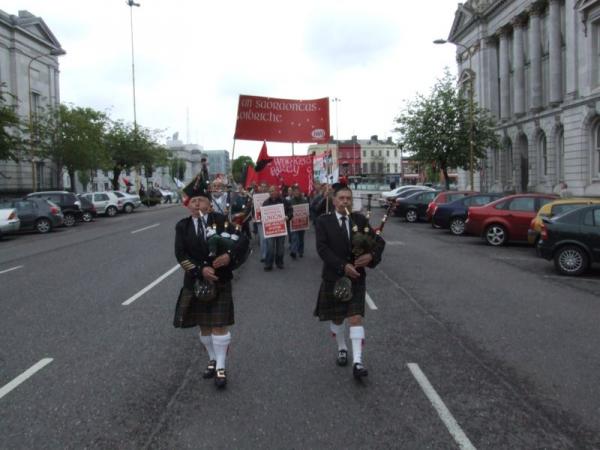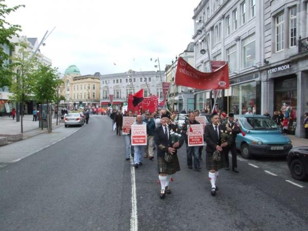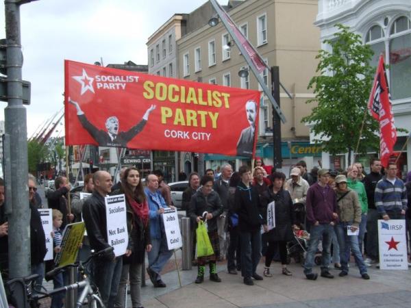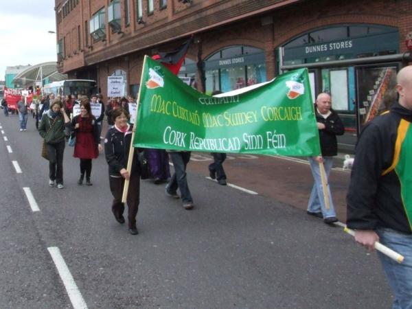 Due to May Day falling on the Sunday of the bank holiday weekend, the starting time was moved from its customary evening hour to 1 p.m. This meant unfortunately that the usual street dance party at Daunt Sq. afterwards that has become an integral part of the celebrations did not happen this time. It must be said however that numbers attending the march held up well, despite fears expressed beforehand that the unaccustomed hour for the march and the competing attractions of the bank holiday weekend would impact negatively on attendance. The turnout from political organisations in Cork was substantial with the visible presence of the Workers Solidarity Movement, The United Left Alliance, the Socialist Party, the Socialist Workers Party, the Workers' Party, Eirigí, the 32-County Sovereignty Movement and Republican Sinn Féin. Also in attendance were a contingent from the Cork Social Welfare Defenders campaign group, and members of the Cork Action Group.