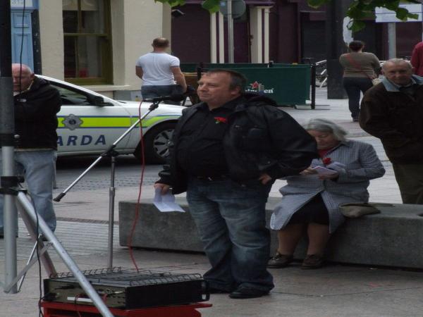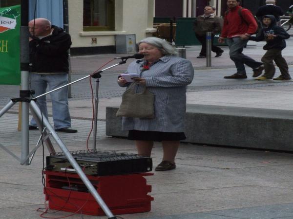 Mr. Murphy's speech criticised the policy of making the working classes of Ireland pay the massive debts of a tiny minority through imposed austerity measures, a policy that has remained unaltered despite the intervening general election. He also noted the rush to privatise state-owned companies such as the ESB and Bord Gáis that is proceeding alongside the cuts and tax increases. He called for repudiation of these debts, and for pressure to be applied both inside and outside the Dáil to prevent the looting of Ireland's economy by the super-rich. Notable among the measures he called for were a campaign of collective refusal to pay mortgages and the withdrawal of labour from key services (i.e. strike action). The full text of Noel Murphy's speech can be read at the end of this report. The speakers at the end-of-march rally were ably compered by Margaret O'Regan, chairperson of the May Day Organising Committee.