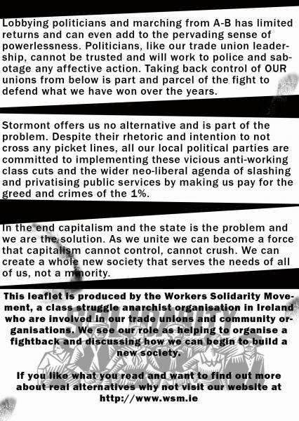 Stormont offers us no alternative and is part of the problem. Despite their rhetoric and intention to not cross any picket lines, all our local political parties are committed to implementing these vicious anti-working class cuts and the wider neo-liberal agenda of slashing and privatising public services by making us pay for the greed and crimes of the 1%.