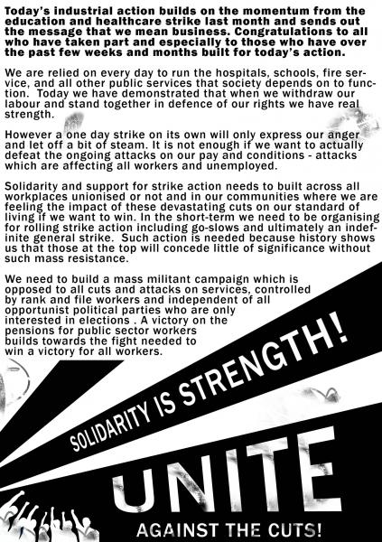 We need to build a mass militant campaign which is opposed to all cuts and attacks on services, controlled by rank and file workers and independent of all opportunist political parties who are only interested in elections . A victory on the pensions for public sector workers builds towards the fight needed to win a victory for all workers.