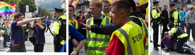 Image: Quinn is pointed out by by one WSM member, a group of 'Rally for Life' stewards gather to protect Quinn, another WSM member is knocked to the ground and arrested by the PSNI after trying to reach Quinn